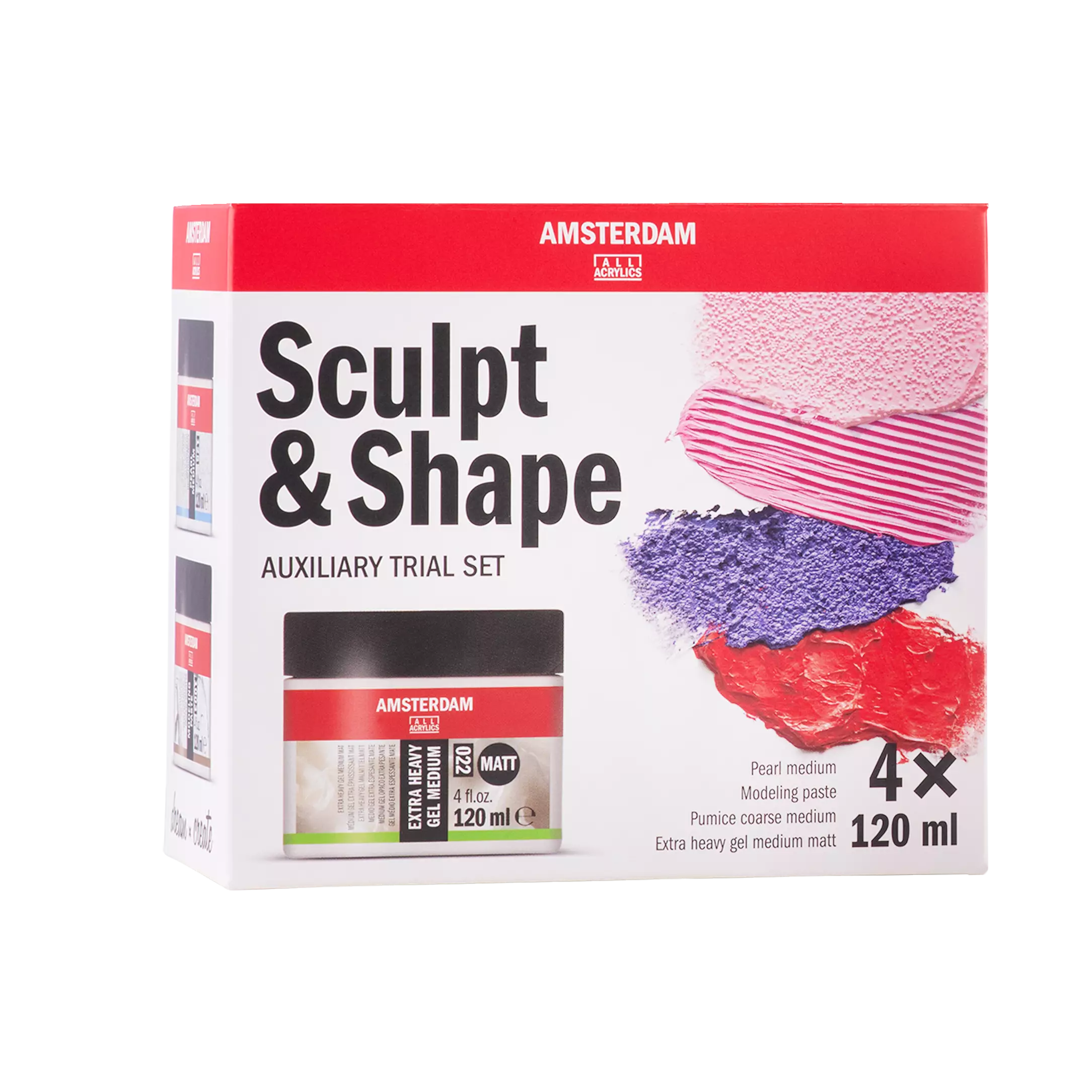 Kaikki mitä tarvitset lisäämään akryylityöhön rakennetta ja massaa. Setissä 4 x 120 ml aineet: Pumice coarse, Modeling paste, Extra heavy gel medium ja Pearl medium.