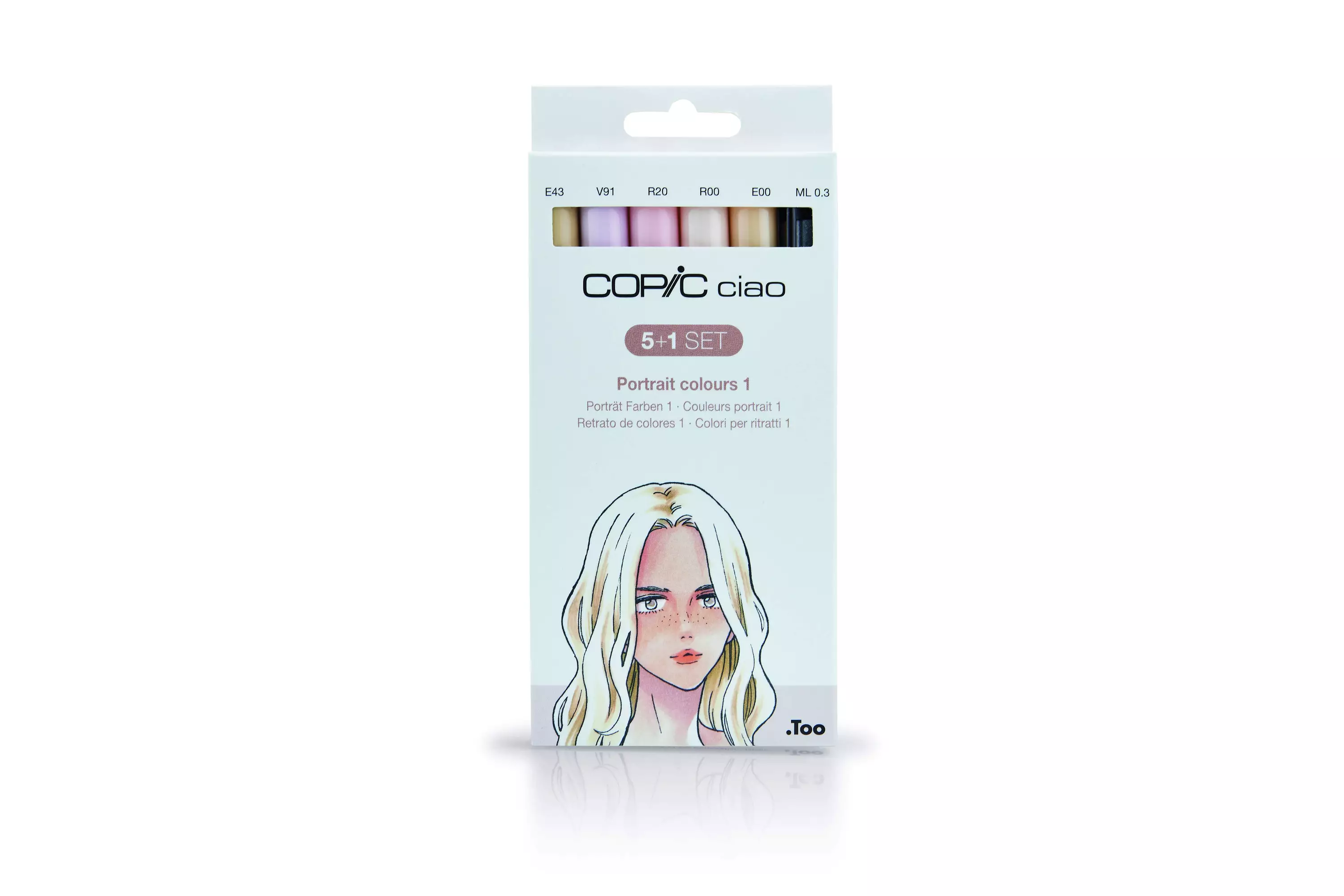 Copic Ciao -alkoholipohjainen huopakynälajitelma sisältää Ciao sävyt E43 (Dull Ivory), V91 (Pale Grape), R20 (Blush), R00 (Pinkish White), E00 (Cotton Pearl) sekä mustan 0,3mm Multiliner -kynän.
