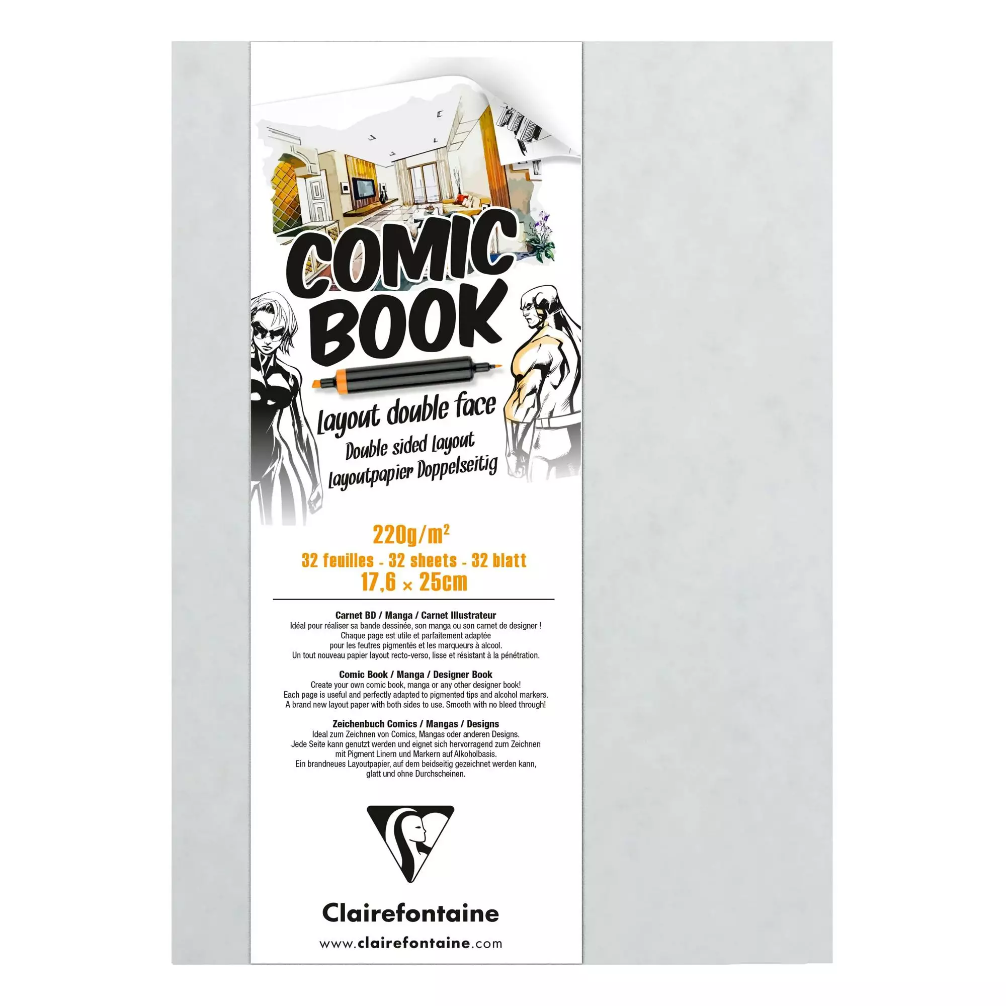 Sarjakuva -tyylinen luonnosvihko on paksua, super-sileää paperia (220 g/m²), 32 arkkia kestävät molemminpuolisen piirtämisen.