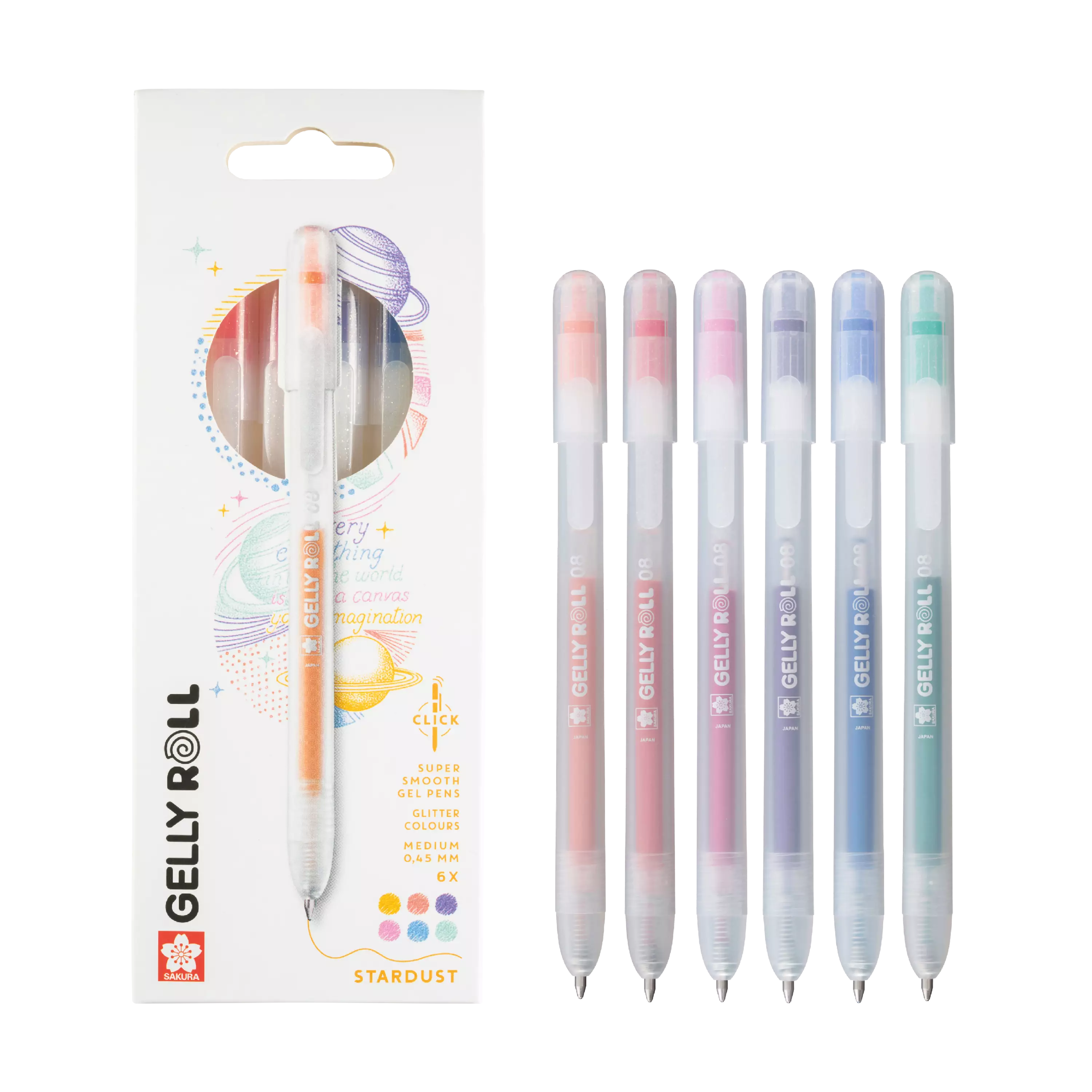 Sakuran korkittomat geelikynät. Terän saa esiin ja piiloon napista painamalla. Stardust -setissä 6 kimaltelevaa tähtipölymustetta: oranssi, punainen, ruusunpunainen, violetti, sininen ja vihreä.