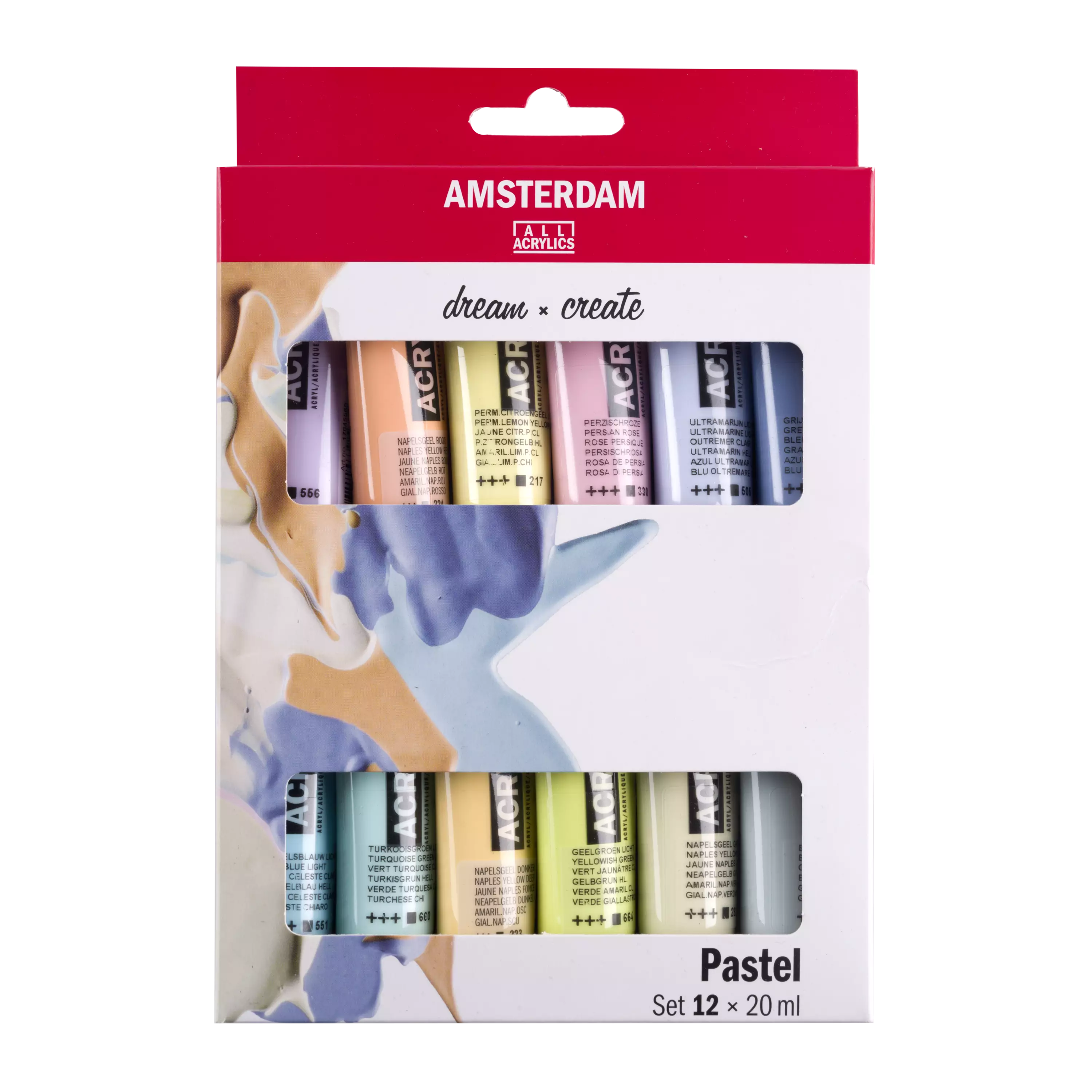 Amsterdam akrylfärgset 12 x 20 ml, täckande pastellnyanser 217, 223, 224, 282, 330, 505, 551, 556, 562, 660, 664 och 750