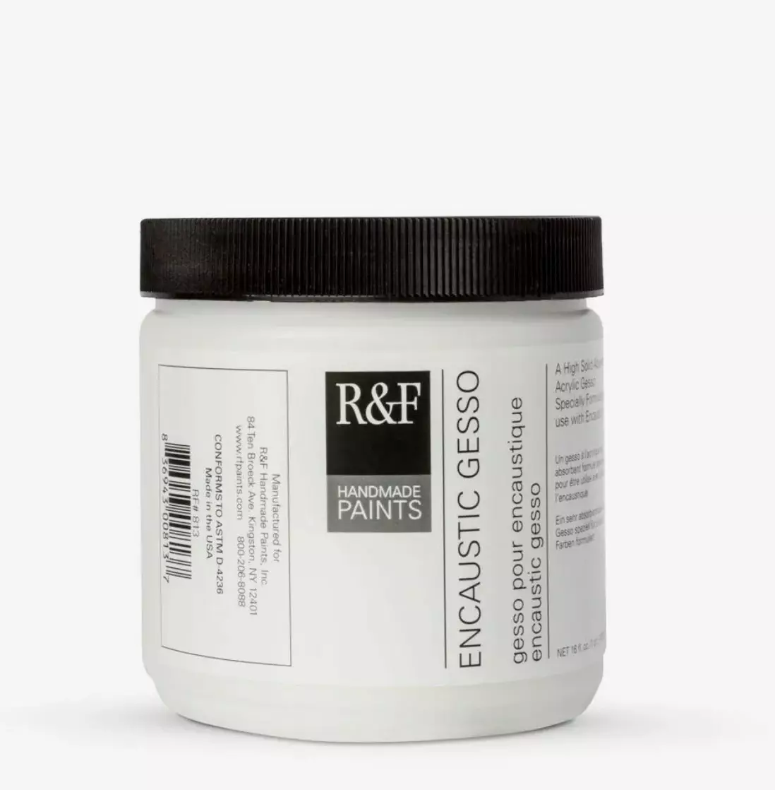 Lättanvänd, vattenbaserad gesso som är speciellt framtagen för användning med encaustic. Denna gesso skiljer sig från typisk akrylgesso genom en högre andel fasta ämnen, vilket gör den mycket sugsam samtidigt som den behåller akryls fästegenskaper. Med R&F Encaustic Gesso kan du enkelt applicera med pensel och den torkar snabbt till användning. Används vanligtvis på fasta ytor (t.ex. platta, trä, tjock kartong) – canvas kan orsaka sprickor i ytan. Encaustic gesso kan blandas med en liten mängd akryltinte och kan slipas.